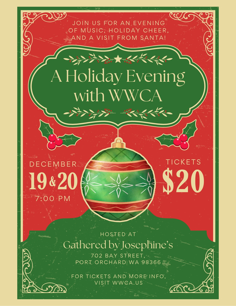 Join Western Washington Center for the Arts in the space at Gathered by Josephines for an evening of song, cheer, and holiday vibes. Some of the best talents in WWCA will be dropping in to do songs ranging from the classics to more modern takes, and rumor is that even Santa himself is expected to swing by for some photos. Come join us for a blast of holiday cheer as we continue to raise funds for our new home and help out local businesses!